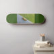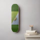 A Dark Green 7 3/4 Skateboard, with a Picture of a Grasshopper, on a porch railing on it.