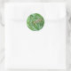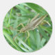This awesome set of round stickers features a detailed macro photograph of a small green grasshopper with brown mottled markings sitting on the grass. In the photograph you can see the detail of the jointed legs, long antennae and black and gold eyes of the grasshopper.