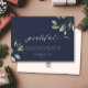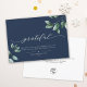 Stylish, elegant script calligraphy business holiday card reads GRATEFUL alongside modern eucalyptus watercolor illustrations, your custom text and message. On the back is space for another message and your corporate logo.