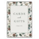 This wedding tabletop sign features a symmetrical design with a central white space bordered by a floral pattern of leaves and pinecones in soft greens, browns, and beige. The elegant serif typography reads "CARDS and GIFTS" with a smaller "THANK YOU" beneath it, conveying a sense of gratitude and sophistication. The natural motifs and muted color palette create a calming and inviting atmosphere, perfect for expressing thanks at your special event.