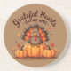 This charming Thanksgiving design features an adorable cartoon turkey with vibrant orange, red, and brown tail feathers perched atop a trio of plump pumpkins. Surrounded by whimsical falling hearts, autumn leaves, and warm seasonal colours, the artwork is framed by the joyful phrase “Grateful Hearts Gather Here” in bold, playful lettering. The illustration radiates a cosy, festive vibe perfect for celebrating gratitude, family, and togetherness during the fall season. Its cheerful and heartwarming aesthetic makes it ideal for spreading seasonal joy and capturing the magic of Thanksgiving gatherings. Whether displayed in a home setting or shared as a thoughtful seasonal gesture, this playful composition adds a lighthearted, seasonal charm. AI generated artwork.
