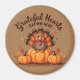 This charming Thanksgiving design features an adorable cartoon turkey with vibrant orange, red, and brown tail feathers perched atop a trio of plump pumpkins. Surrounded by whimsical falling hearts, autumn leaves, and warm seasonal colours, the artwork is framed by the joyful phrase “Grateful Hearts Gather Here” in bold, playful lettering. The illustration radiates a cosy, festive vibe perfect for celebrating gratitude, family, and togetherness during the fall season. Its cheerful and heartwarming aesthetic makes it ideal for spreading seasonal joy and capturing the magic of Thanksgiving gatherings. Whether displayed in a home setting or shared as a thoughtful seasonal gesture, this playful composition adds a lighthearted, seasonal charm. AI generated artwork.