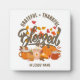Stylish GRATEFUL THANKFUL BLESSED IN JESUS' NAME Christian Thanksgiving plaque with pumpkin treats of lattes, pumpkin pie and autumn fall leaves. IN JESUS' NAME is CUSTOMIZABLE so you can add your family name or other text. Ideal gift for your home decor or friends and family throughout the year and especially for pumpkin spice latte lovers during Thanksgiving season.