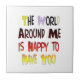 The design features the warm, impactful message, "THE WORLD AROUND ME IS HAPPY TO HAVE YOU," rendered in playful, mismatched, multi-coloured typography. The diverse colours—from yellow and purple to red and orange—give the piece a fun, kinetic, and uplifting aesthetic that is instantly eye-catching and sincere.
