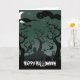 Graveyard black and gray Halloween card design, featuring a cemetery with spooky trees, graves, crosses, skulls, a witch, an owl, bats, and clouds and the crescent moon over it on gray-green background.
