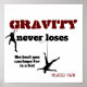 Gravity never sleeps. Gravity never lies. It never takes a day off, it never calls in sick and it never LOSES. With that in mind, CLIMB ON, but know that you can’t win against gravity so just accept the tie and live to climb another day.