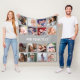 Personalized photo gift fleecy blanket featuring a gray background that can be changed to any color, 16 pictures of your choice, and a simple text template.