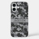 Customize this gray camouflage iPhone 16 case with your name in a trendy modern CAP font in dark gray on light gray. It's masculine and perfect for your favorite military, hunting, country or outdoorsman!