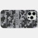 Customize this gray camouflage iPhone 15 pro max case with your name in a trendy modern CAP font in dark gray on light gray. It's masculine and perfect for your favorite military, hunting, country or outdoorsman!