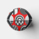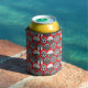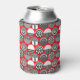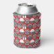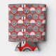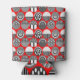 This can cooler has a geometric design of ovals with different patterns in gray in each half all on a field of red.