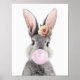 Gray rabbit blowing a pink bubble gum with an anemone flower