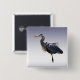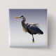 This pin features the Great Blue Heron, a large wading bird in the heron family Ardeidae, common near the shores of open water and in wetlands. He is the largest North American heron. Noteable features include slaty flight feathers, red-brown thighs, and a paired red-brown and black stripe up the flanks; the neck is rusty-grey, with black and white streaking down the front; the head is paler, with a nearly white face, and a pair of black plumes running from just above the eye to the back of the head. The feathers on the lower neck are long and plume-like. Because this is the breeding season, he also has plumes on the lower back and an orange bill. He is standing in shallow water and his feathers are backlit by the luminous sunlight.