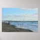 A Great Blue Heron patrols the beach of Cape Canaveral, Florida, where several fishermen have set up their poles. The heron is likely hoping for a chance to grab a discarded fish.