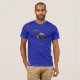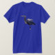 This shirt features the Great Blue Heron, a large wading bird in the heron family Ardeidae, common near the shores of open water and in wetlands. He is the largest North American heron. Noteable features include slaty flight feathers, red-brown thighs, and a paired red-brown and black stripe up the flanks; the neck is rusty-grey, with black and white streaking down the front; the head is paler, with a nearly white face, and a pair of black plumes running from just above the eye to the back of the head. The feathers on the lower neck are long and plume-like. Because this is the breeding season, he also has plumes on the lower back and an orange bill. He is standing in shallow water and his feathers are backlit by the luminous sunlight.