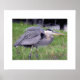 In the original photograph by ZoeSPEAK in this print, the Great Blue Heron, standing along the bank of a canal, sees something farther up the waterway, a possible threat to his territory. He puffs up the bluish gray feathers on his back to make himself look bigger. With his long, thin legs spread as he looks straight ahead, the bird is ready to defend his space in the green grass. Dark, rippled reflections on the water form the background of the scene. There is a wide white border around the photograph, with title and photographer's credit in small text under the photo.
