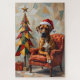 This whimsical modern abstract painting depicts a massive Fawn Great Dane, rendered in geometric shapes, wearing a simple Santa hat while enjoying a cozy nap by a stylized Christmas tree. A bold and contemporary holiday design.