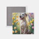 A cheerful dog sits peacefully on lush green grass, surrounded by colourful spring blooms under a soft blue sky. This digital oil painting captures a serene moment with expressive brushstrokes, warm colours, and a sense of gentle joy.