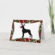 Fun Great Dane Christmas Card has the dog breed silhouette, with reindeer antlers and a bright red glowing nose. The background is a cheery holiday plaid with reds and greens. The inside reads, "Wishing you and your family a wonderful holiday season!" Personalise the message to your own easily. Cute dog lover Christmas cards.