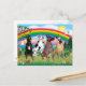 Four Greyhounds, black, harlequin, brindle and fawn have been placed into a background by artist Jean Fitzgerald called "Rainbow Bright". It is a popular Rainbow Bridge design for someone who has lost one of these magnificent dogs. A bright rainbow against a colourful sky, a shy rabbit in the bushes and lots of brightly coloured flowers along the beautiful water where a sail boat glides serenly along the horizon.