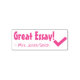 This motivating rubber stamp design features the message "Great Essay!" and a custom educator's name. It also features a decorative check mark. It could be used by a teacher, educator, or tutor when grading student work, to acknowledge that a student has done an exceptional job.