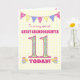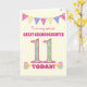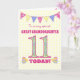 A pretty 11th Birthday card for your great-granddaughter, with polka dot bunting, primrose flowers and numbers filled with a primrose pattern, all on a pale yellow check gingham background. The front cover message is, 'To a very special GREAT GRANDDAUGHTER 11 TODAY!' The inside message is just a suggestion and you can easily personalize it or delete it if you prefer.