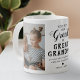 Modern great-grandmother picture mug featuring the cute saying "you put the great in great grandma", 2 photos of the grandchildren, a heart, their names, and the caption "grandmas hold our tiny hands for just a little while, but our hearts forever".