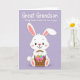 This card features a stylized white bunny with soft-edged ears, one slightly tilted, and rosy cheek accents that give it a sweet, friendly look 🐰. Its wide dark eyes and small pink nose sit above a gentle smile, suggesting a caring, close bond, like it’s happily bringing a treat to someone special. The bunny holds a woven basket with lightly hinted texture, and a bright pink bow tied neatly at the front adds a tender, gift-like touch. Inside the basket are glossy egg-shaped treats in orange, green, blue, and purple, each shaded to look shiny and rounded. The background is a smooth, soft lavender field that keeps the focus on the bunny and the basket while adding a calm springtime mood 🌷. Near the top, the words “Great Grandson” appear in white, rounded lettering, with a smaller white line beneath that reads, “A big Easter basket of love to you.” Small details like the fluffy white tail and the pink pads on the bunny’s feet are visible near the bottom of the design.