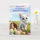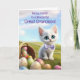 Happy Easter to my great-grandson! Picture a bountiful basket filled with colorful Easter eggs resting on a grassy knoll, accompanied by an adorable cat. The text can be customized however you like.