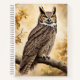 A majestic great horned owl is perched in a tree, surrounded by brown autumn leaves, on a neutral sandy background, Beautiful notebook, and perfect for anyone who loves owls, birds, nature, and the outdoors.