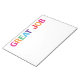 This 11 x 8.5 pad of tearaway notes is perfect for anyone! With it's bright, happy colours and classic block print saying "Great Job" it would be great to give anyone who has done a great job lately or it would be a wonderful note to put on someone's lunch, desk, school work, computer, etc.