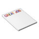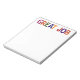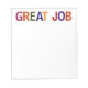 This 5.5 x 6 pad of tearaway notes is perfect for anyone! With it's bright, happy colours and classic block print saying "Great Job" it would be great to give anyone who has done a great job lately or it would be a wonderful note to put on someone's lunch, desk, school work, computer, etc.