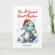 A fun Dinosaur Christmas card for a great Nephew with a blue cartoon baby dinosaur wearing a red Santa's hat with snow and fir trees in the background. All text can be amended . Customise by amending the the title and who it is for, then personalise it with a name and your own message inside .. A sweet, cute gender neutral design for those children and toddlers who love Dinosaurs girls and boys alike,
