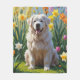 A cheerful dog sits peacefully on lush green grass, surrounded by colourful spring blooms under a soft blue sky. This digital oil painting captures a serene moment with expressive brushstrokes, warm colours, and a sense of gentle joy.