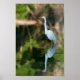A Great White Egret standing in a shallow river stalking a fish. The reflection of the bird is seen in the still calm waters.