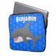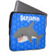 A happy, hungry great white shark is swimming in the ocean. Drawn in cute cartoon illustration style on a blue background for a fun day!