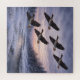 This 676-piece square jigsaw puzzle features a small flock of Greater White-fronted Geese flying over a quiet winter river at sunset, inspired by Japan’s snowy countryside.