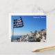 Greece Postcard with Santorini landscape in Oia village, with greek flag.