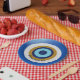 Paper plate Greek eye design. You can customise this paper plate with your favourite Greek place or any other text of your choice. Should you require any help with customising then contact us through the link on this page. Greek design personalised paper plate