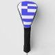 Golf head cover featuring the flag of Greece in nine blue and white alternating stripes. To represent Eastern Orthodox Christianity, there is a cross in the upper right side. A perfect way to share your love of all things Greek on Oxi Day or anytime. The image here takes up the entire design space, using a bit of artistic license to make the flag look its best on this item.