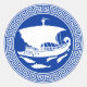 Classic Greek key design with Greek sail ship and playful dolphins. White blue.