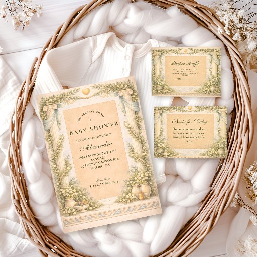 Inspired by classic Greek architecture and Mediterranean gardens, this elegant baby shower design features soft stone columns, olive branches, flowing drapery, and warm parchment tones. The timeless palette of sage green, ivory, and antique gold creates a refined yet gentle look, perfect for a sophisticated baby shower with European charm. Ideal for parents who love classical aesthetics, old-world elegance, and serene botanical details.