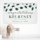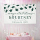 Modern graduation party banner featuring a simple white background that can be changed to any colour, falling green mortarboard caps, and a congratulations text template that is easy to personalise.