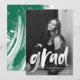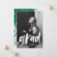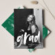 Modern graduation thank you card featuring the graduate's photo with "grad" in a white brush script overlay. Personalize the front of the graduation thank you card by adding the graduate's name, school, name, and graduation year. The back of the card features space for your typed or handwritten message with a background of painted green brushstrokes.