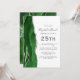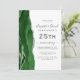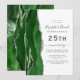 The left-hand edge of this elegant modern wedding anniversary party invitation features a green watercolor agate border trimmed with silver faux glitter. The customizable text combines charcoal gray handwriting, copperplate and italic fonts on a white background. The reverse side features a matching green and silver agate design.