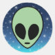 A green alien head with big black oval eyes and a small black slit for a mouth. The background is a dark to light blue gradient colour dotted with white stars.