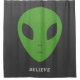 A black Shower Curtain with a green alien head and a customisable message "Believe"! Perfect for a geek bathroom decoration!