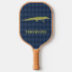 Create a personalised gift that's perfect for someone who loves alligators and other animals. This pickleball paddle has a realistic style illustration of an alligator in an olive green colour set against a navy blue patterned background and is ready to be personalised with a name in matching olive green lettering. The reverse side has a coordinating alligator pattern.