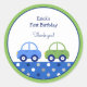 Personalised Green and Blue Car First Birthday Classic Round Sticker.