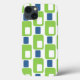 This iPhone case has a mid-century modern design of retro lime green and blue rectangles.