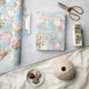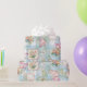 The green and blue garden party wrapping paper has a vintage and shabby chic look to it. The colourful design is soft, elegant, and cute, making it perfect to wrap a special gift for your mum, sister, friend, bridal shower, or even your teacher. The paper is adorned with watercolor illustrations of butterflies, teacups, teapots, hearts, flower bouquets, and round and square frames. All of these elements are set against a delicate background of white and blue paint brush squares and a green screen.